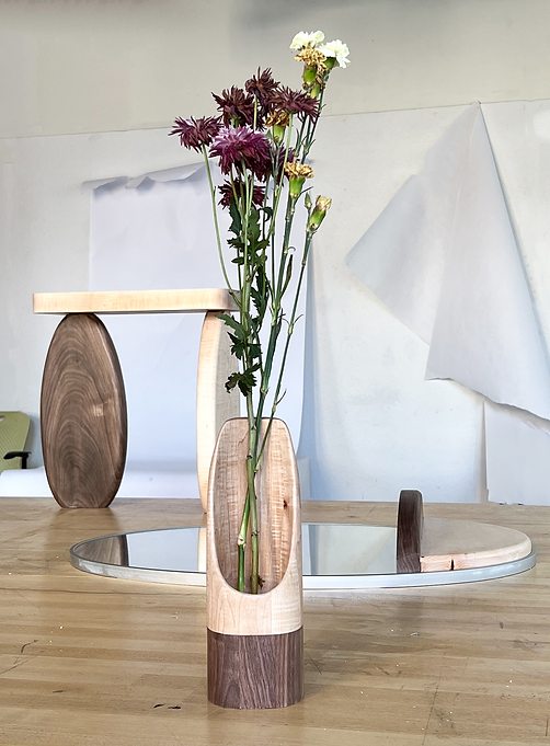 Toval is a word combining oval and taper. The family resemblance is both the Toval concept and the combination of maple and walnut. Both woods have incredible marbling which warms up a space when light comes in. ​